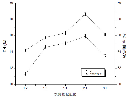 以核桃降壓肽的ACE抑制率和水解度為指標分別考察雙酶復配配比、底物質量濃度(g/L)、酶添加量(U/g)、三個因素對核桃降壓肽制備的影響,進行單因素實驗。