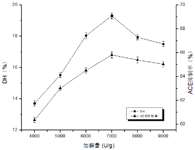 [11]。將水解溫度和pH調節(jié)**風味蛋白酶的**佳條件(即溫度為50℃,pH6.5),用同樣的方法保持系統的pH不變,同時間隔一定時間記錄消耗的NaOH量。酶解結束后酶解液立即于90℃沸水中滅酶10min,8000r/min離心15min取上清液進行水解度和ACE抑制率測定。